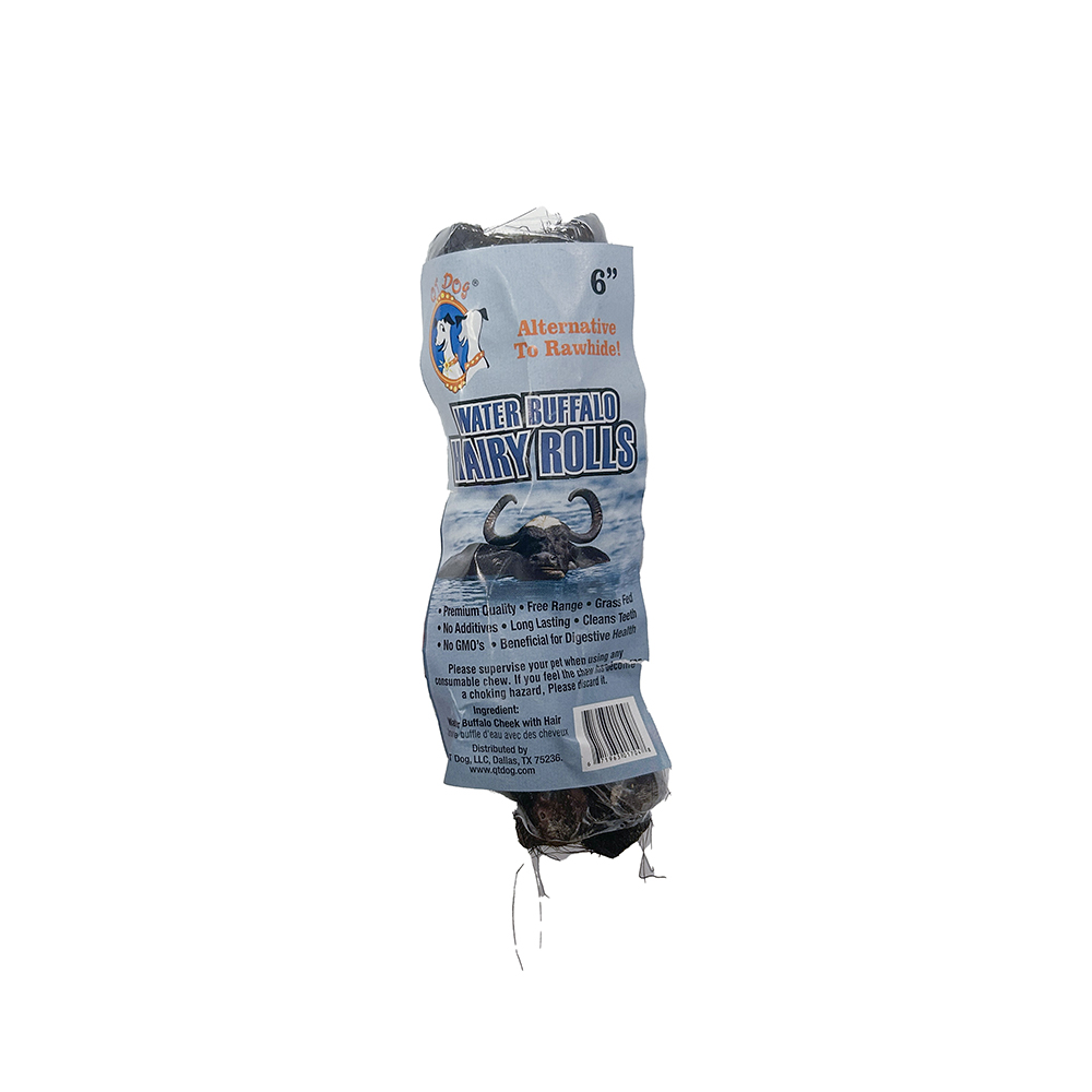 QT DOG Water Buffalo Cheek Roll w/ Hair 6″ (12)